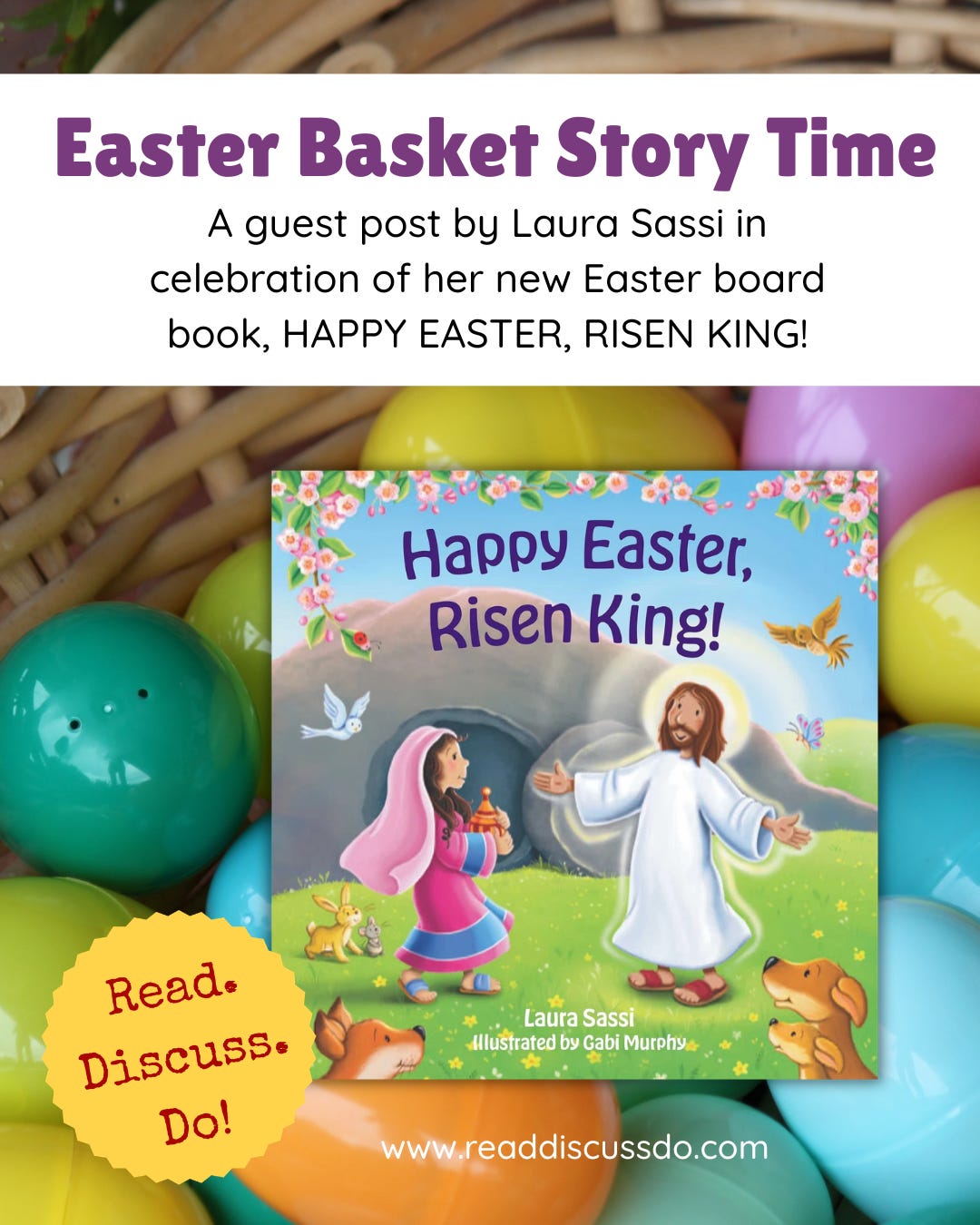 But amidst the fun of jelly beans, chocolate bunnies and colorfully decorated eggs, it’s good to introduce our kids to the deeper significance of Easter. With that in mind, here’s a selection of Easter-themed kids’ books that your little bunnies, I mean children, might enjoy along with ideas for an Easter basket themed Read, Discuss Do.