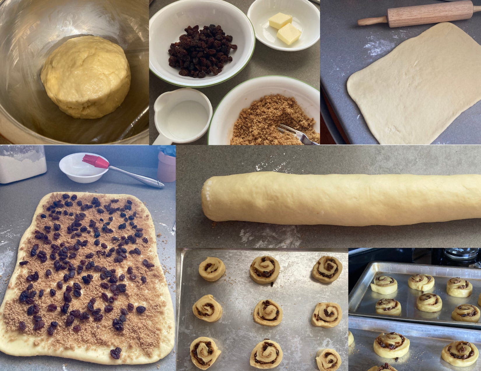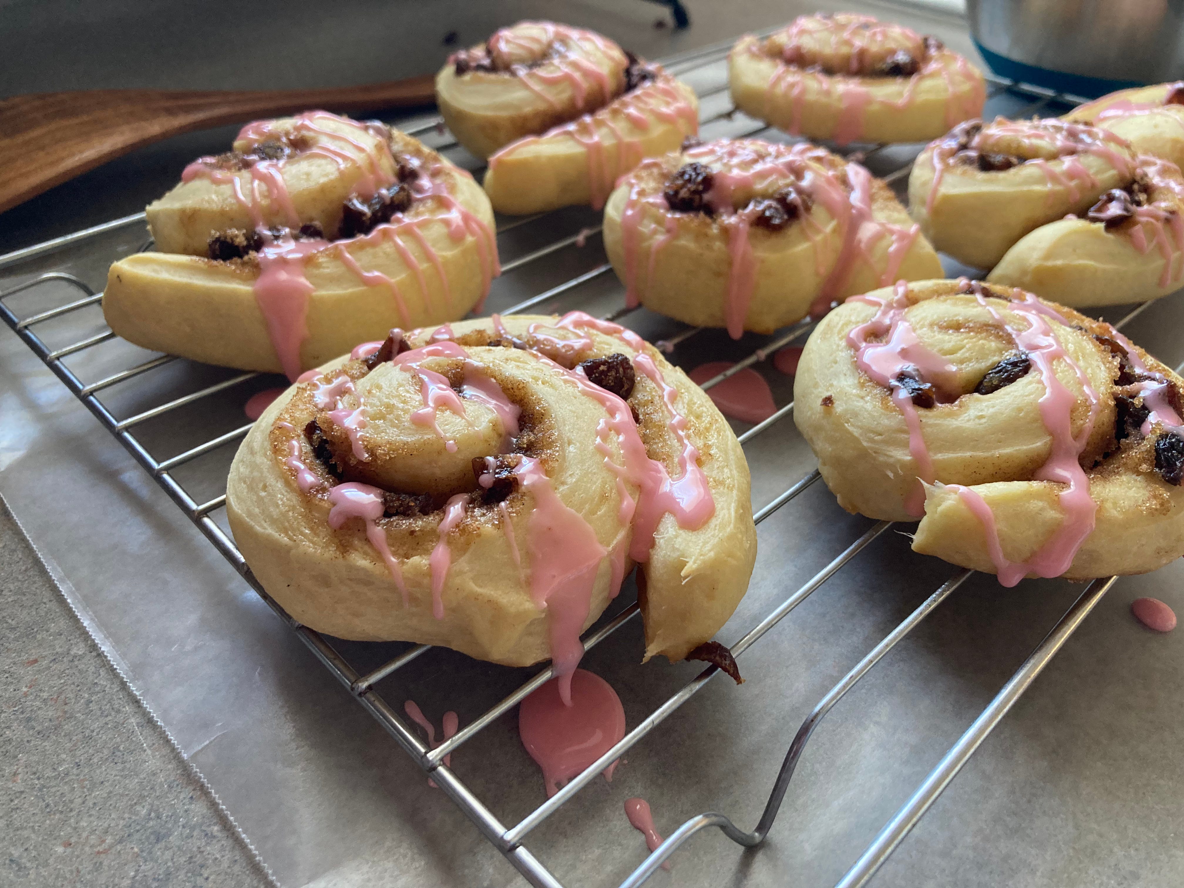 The “Bout’s Buns” recipe is fairly simple and easy to follow, with basic ingredients that many people already have in their kitchens. And if you don’t usually make yeast breads, then yeast is easy to find in the baking aisle! Because the dough rests in the fridge overnight, it’s very chilled and a little stiff in the morning, so I let mine rest a while to come closer to room temperature before I kneaded it. It also required more than the 1 hour for the buns to rise because my house was a little cool. Putting the buns in the oven with the light on helps, though! Just be sure to take them out of the oven before you preheat it. The buns are basically cinnamon rolls with raisins in them, with some pink icing for a fun touch. They are buttery and sweet, but not overly sweet. Best eaten warm!