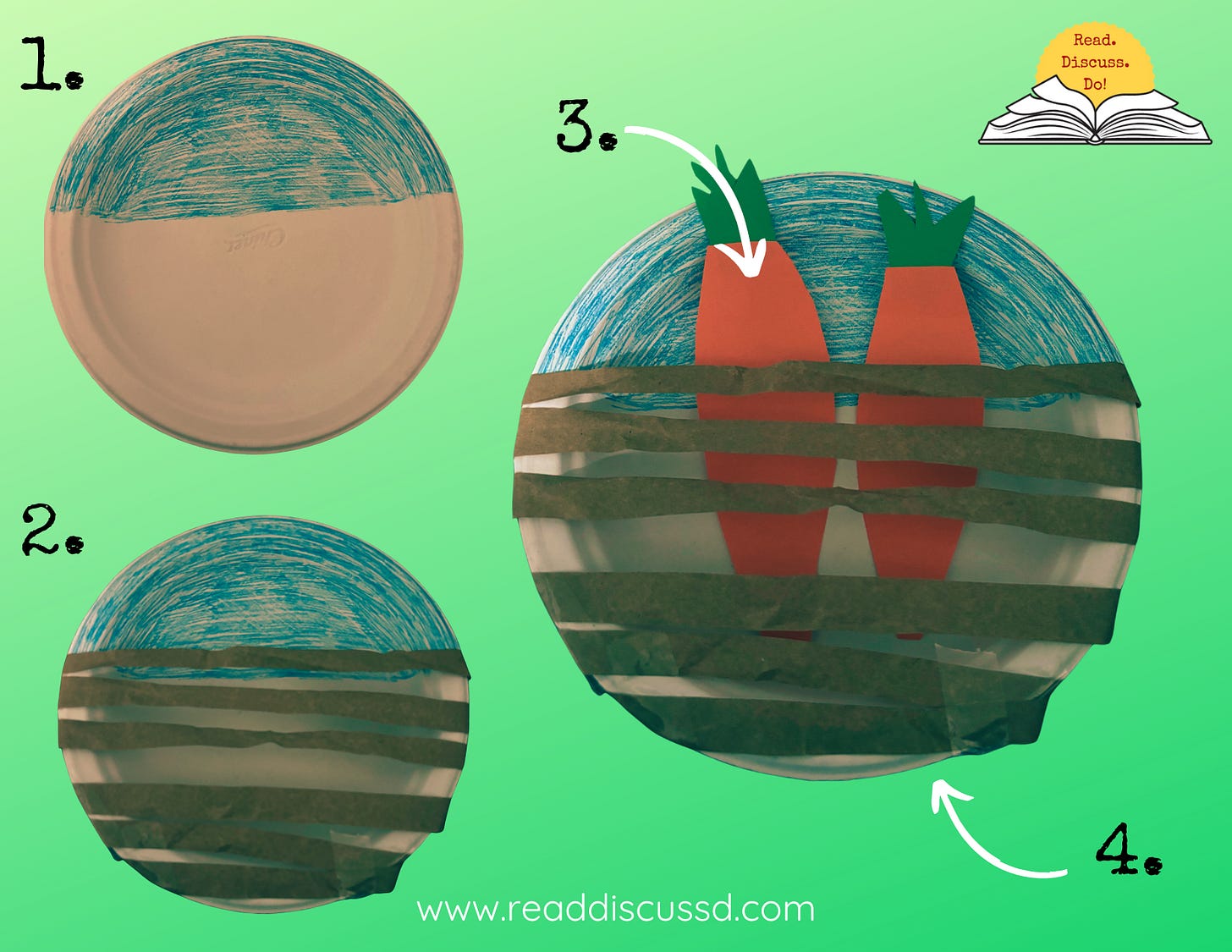 Make this cute farming craft! All you need is a white paper plate, some colored paper, a blue crayon, and some tape or glue.